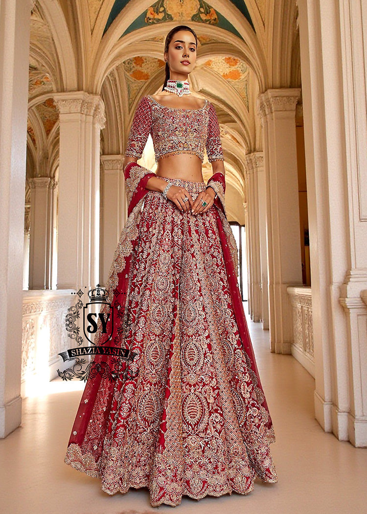 The Bridal Lehenga Choli dress is a combination of elegance and magic of details. The Raw silk fabric is covered with a delicate glitter pattern exquisite embellishments that plays with light in every movement.