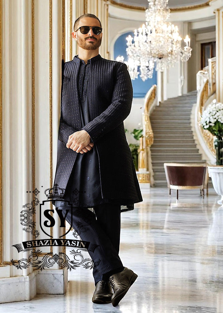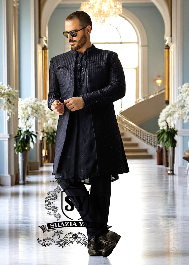 At Shazia Yasin, they have been accompanying grooms and gentlemen in their most important moments for more than 20 years, with Heavy Embroidered Navy Blue Sherwani Etobicoke, Canada Designer Sherwani for Groom Sherwani suits that combine elegance, personality, and tradition.
