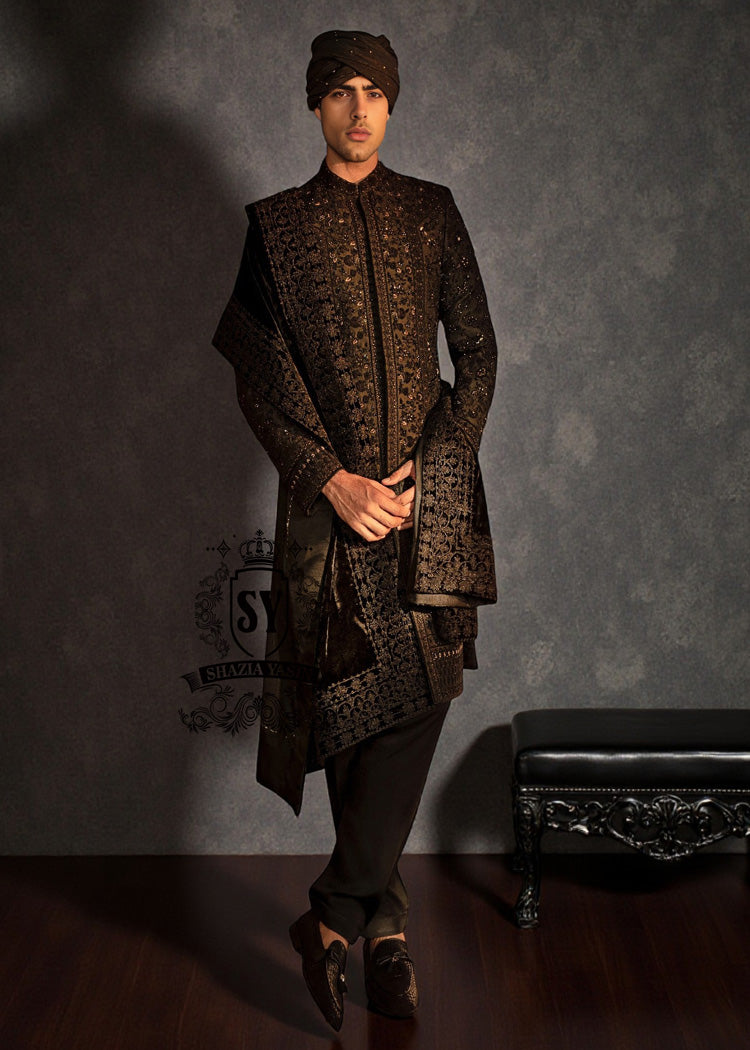 A man in all-black always has his charm. Choose the groom's Sherwani suit for your big day from us.